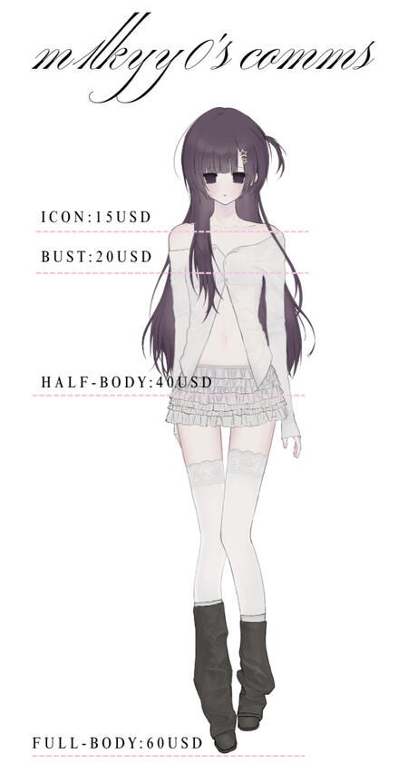 Contact me on Instagram,Twitter, or m1lkyy0 on discord.> Please send me a detailed description WITH references or pictures of what you would like to request.> If the commission is approved, I will tell you the approximate time of how long it will take to finish the piece.> Once paid in full, I will start the commission.> By commissioning me, you grant me the right to post your commissioned piece on my socials and for my portfolio.> No refunds will be issues unless I am unable to complete the piece.> I, the artist, have full and exclusive rights to the original artwork.